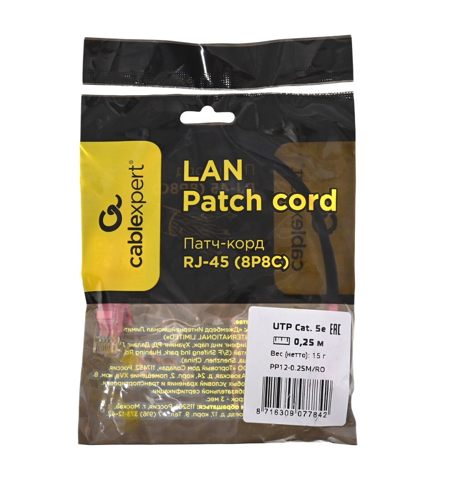 —Патч-корд UTP Cablexpert PP12-0.25M/RO кат.5e, 0.25м, литой, многожильный (розовый)