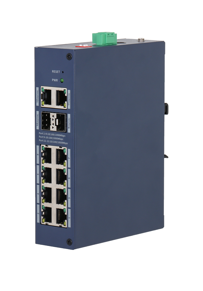 Порты: 8 RJ45 10/100/1000Мбит/с, 2 RJ45 10/100/1000Мбит/с, 2 SFP 1000Мбит/с (uplink); питание: 12В(DC); грозозащита: до 6кВ; рабочая температура: -30°С~+65°С;  IP30, IK06; монтаж на DIN-рейку