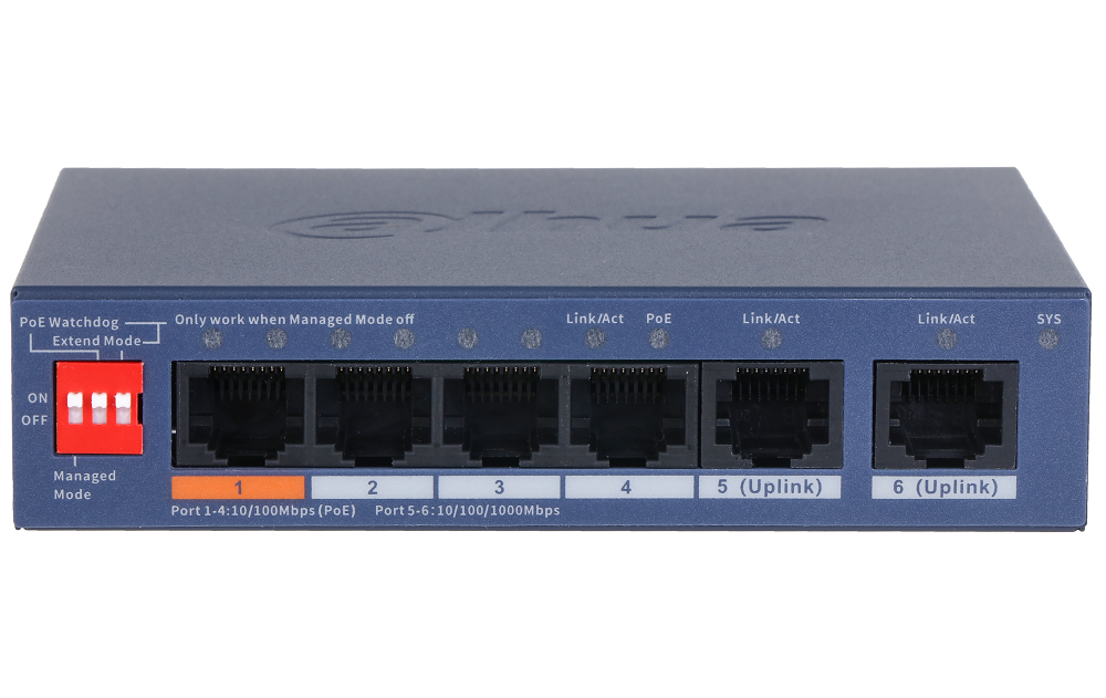 Порты: 4 RJ45 10/100Мбит/с (PoE/PoE+/Hi-PoE), 2 RJ45 10/100/1000Мбит/с (uplink); мощность PoE: порт 1 до 60Вт, порты 2~4 до 30Вт, суммарно до 60Вт; PoE watchdog, передача до 250м; питание: 53В(DC).